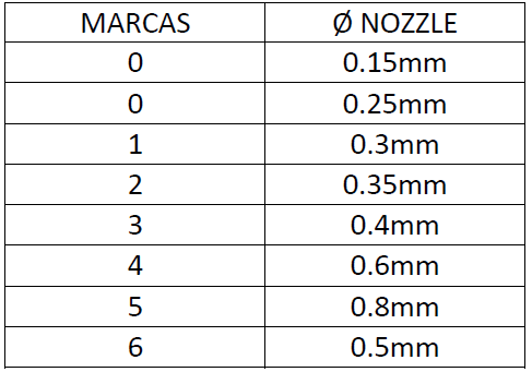Os nozzle E3D são identificáveis com marcações nos planos da cabeça hexagonal, consulte a tabela abaixo para identificação: