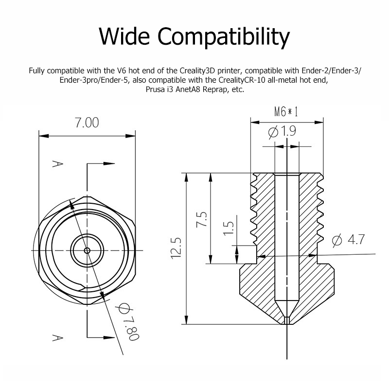 A medida 1,75mm é referente à espessura do filamento compatível com este nozzle para impressora 3D.