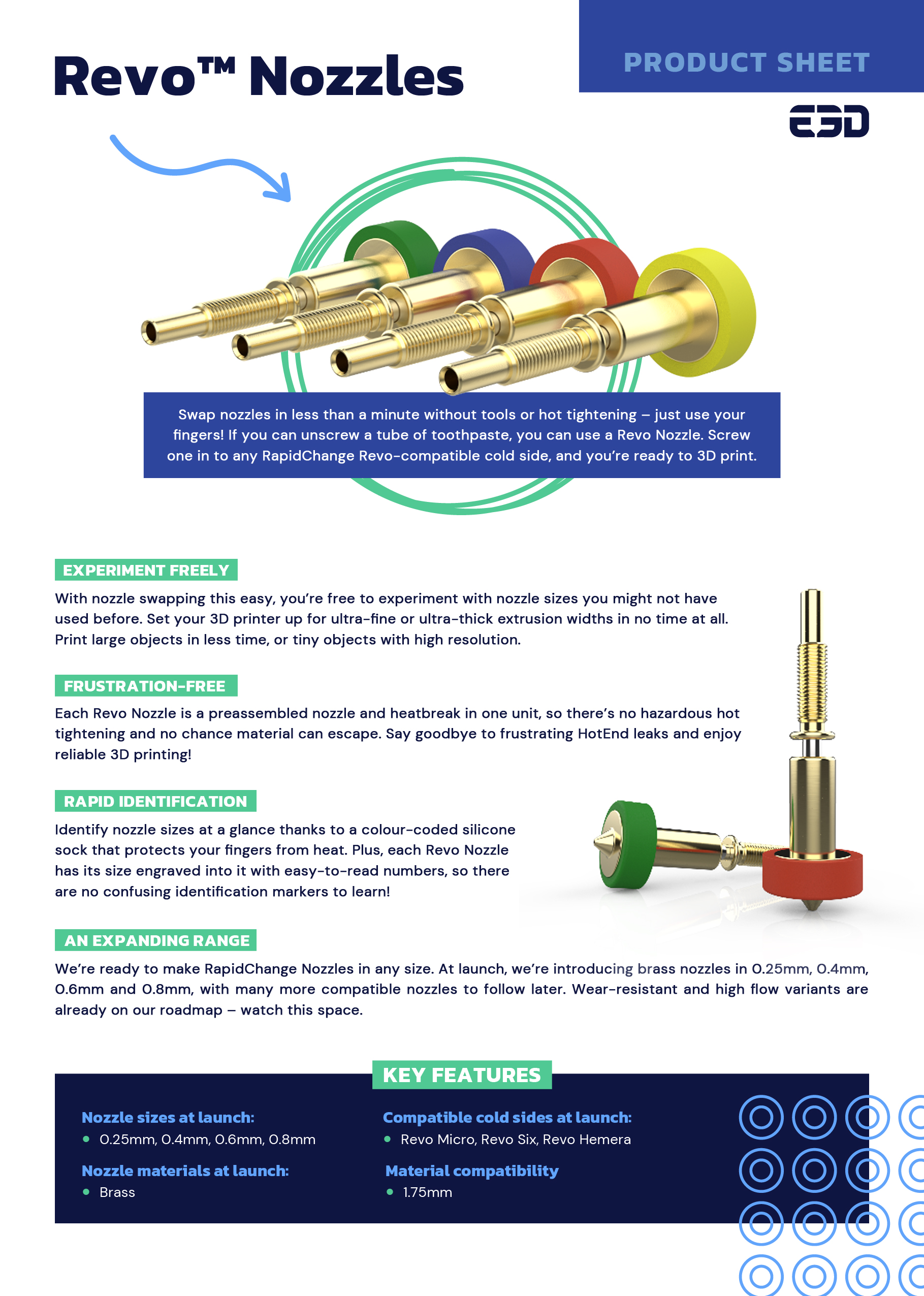 Descubra os nossos nozzles Revo para o seu sistema de extrusão de impressão 3D, a partir de E3D. Para trocas de nozzles sem complicações, sem a necessidade de ferramentas ou aperto a quente.