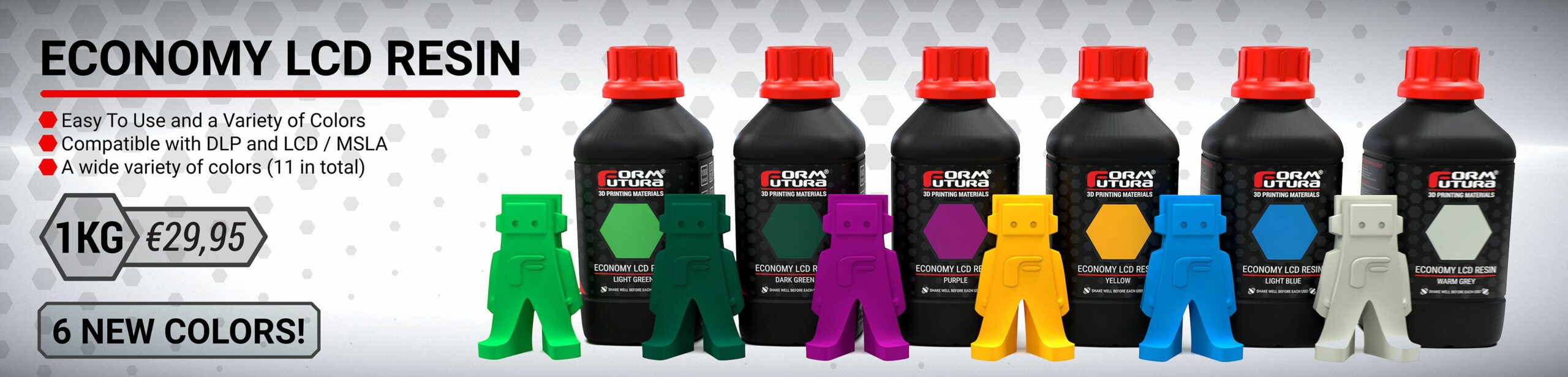FormFutura Economy LCD Resin is our entry level 3D printing resin. This resin is ideal for beginners and prints with a very limited smell. It combines accuracy with short curing times and a nice matte surface finish. Our Economy LCD Resin makes resin 3D printing more accessible.