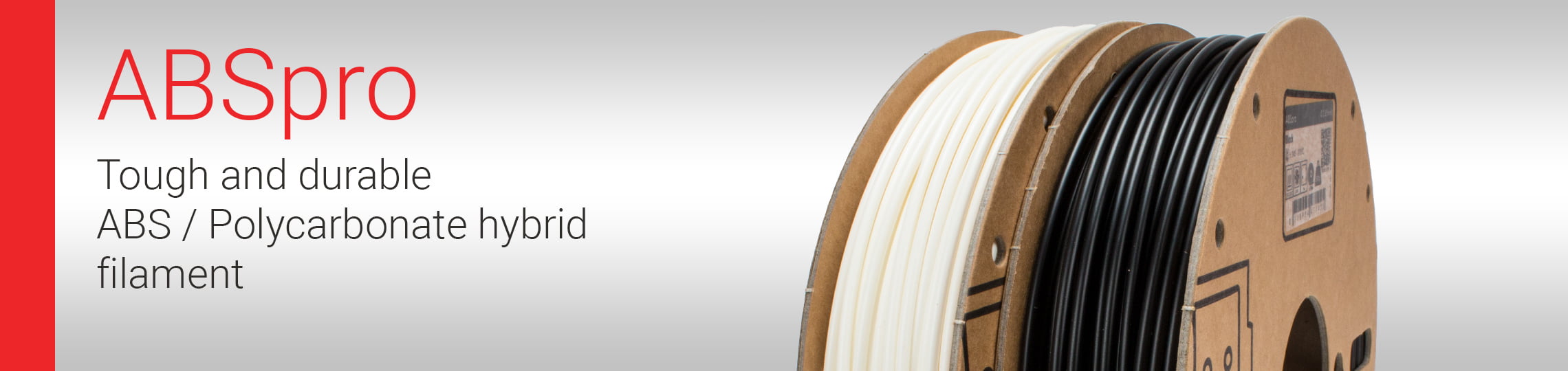 *) Because of the relative high percentage of added PolyCarbonate, ABSpro has a tendency to warp and therefore it is recommended to use a temperature-controlled build chamber and to prepare your heat bed with DimaFix fixative spray when 3D printing large(r) scaled objects with ABSpro.