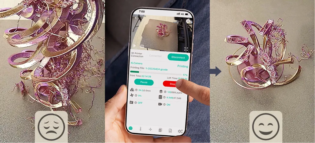 Com a câmara Beagle, pode aceder para verificar o estado de impressão pela aplicação Beagleprint em qualquer lugar e em qualquer altura. E pode parar a impressão através da aplicação quando houver problema, a fim de poupar o filamento e o seu tempo.