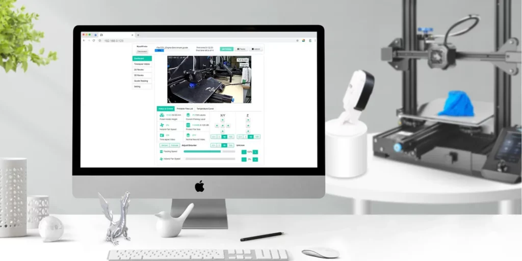 -controlar a impressora à distância (gerir ficheiros a imprimir, interromper impressões durante a impressão caso haja algum erro, temperatura da cama e nozzle, movimentar a cama ou o extrusor, etc) pelo computador ou telemóvel;