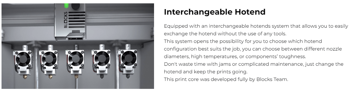 Print Core de troca fácil – Equipado com um sistema de hotend trocável que permite ao utilizador trocar facilmente o hotend sem o uso de quaisquer ferramentas