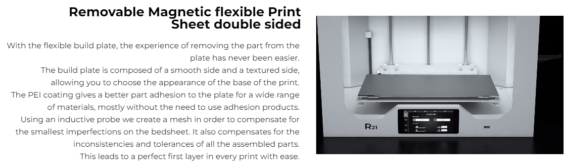 Cama Fléxivel e Magnética – Cama quente e magnética com uma base de impressão flexível composta por um lado liso e um lado texturizado com revestimento PEI.