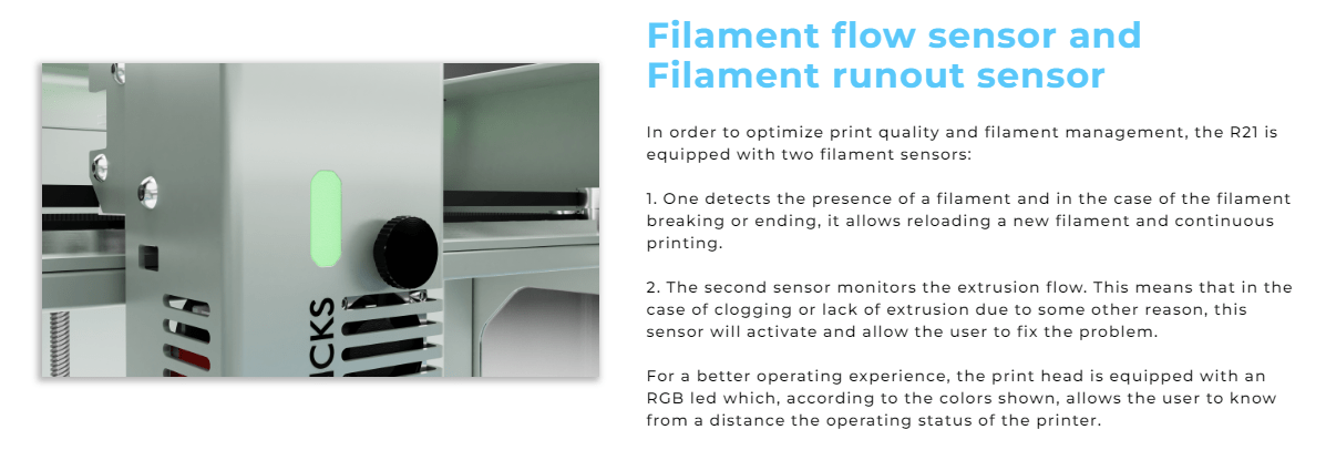 Sensor de filamento – Equipada sensor de fluxo e de falta de filamento para otimizar a qualidade de impressão e gestão do filamento