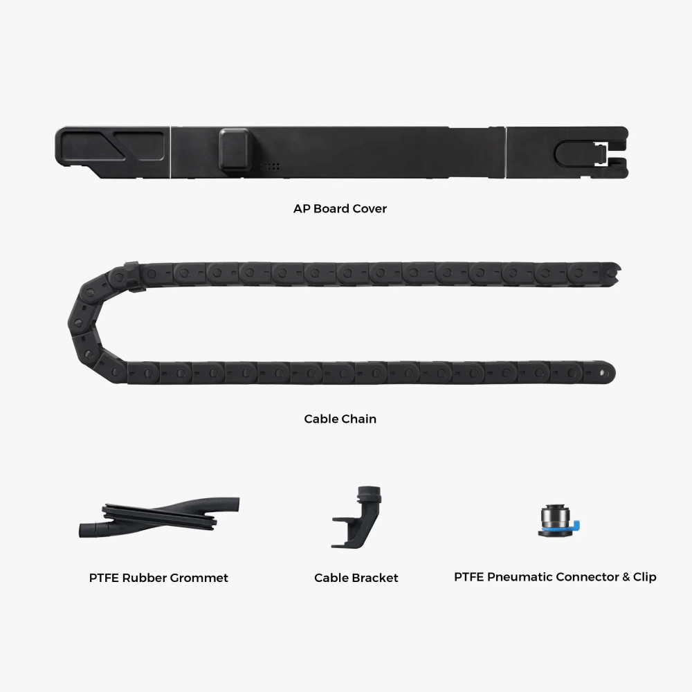 Com a corrente de cabo montada, a trajectória do cabo da cabeça de ferramenta e do tubo de alimentação pode ser confinada em segurança ao plano horizontal durante a impressão. Pode também proteger o cabo da cabeça de ferramenta e o tubo de alimentação de ser danificado durante a dobragem repetitiva em resultado do movimento.