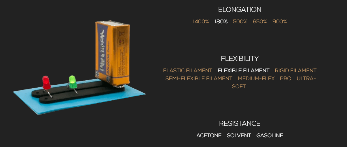 Graças à sua dureza shore 92A, é compatível com 90% das impressoras 3D existentes no mercado. Oferece duas das propriedades mais cobiçadas na impressão 3D: flexibilidade e condutividade.