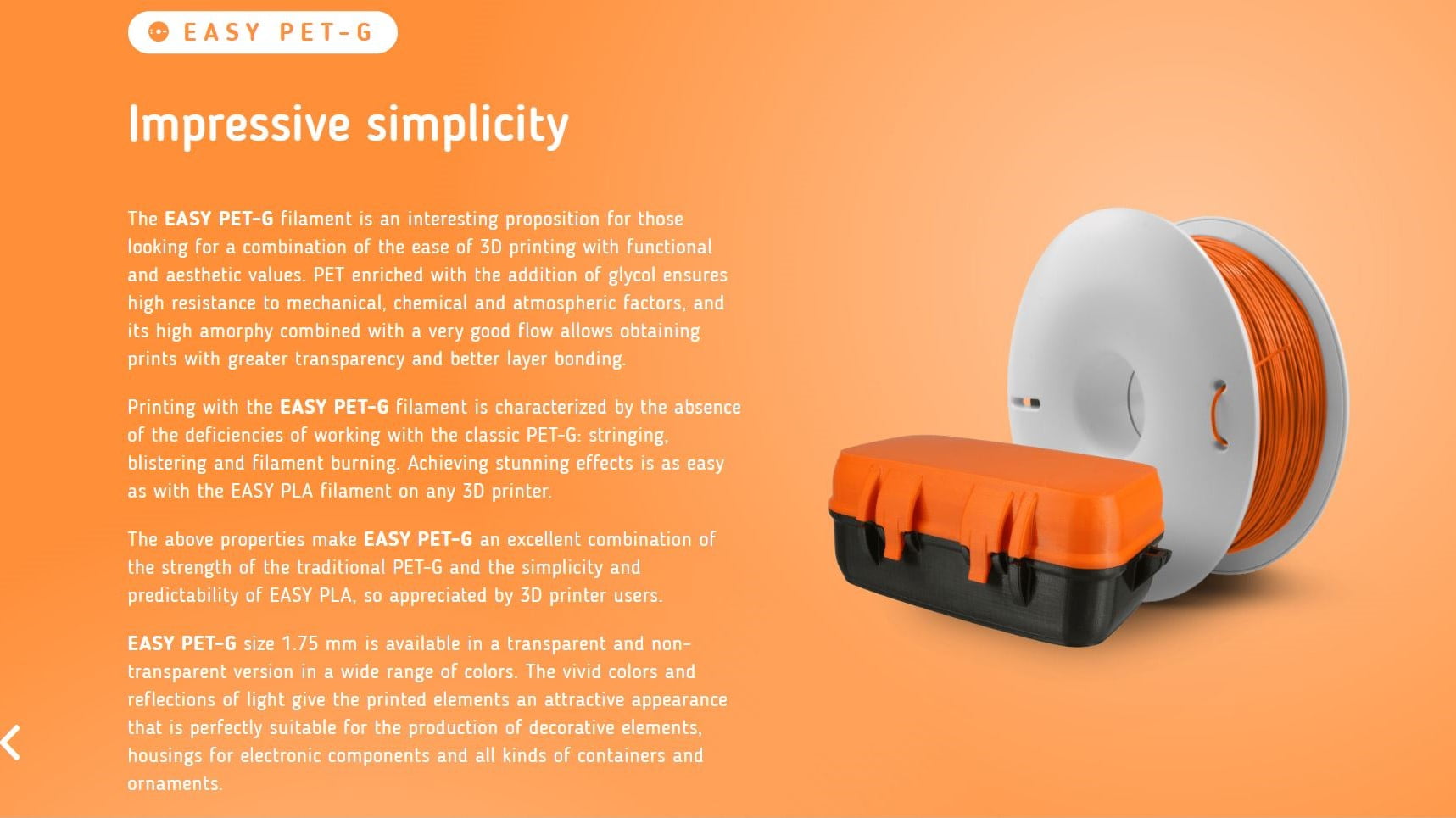 EASY PETG combina a facilidade de impressão do PLA e alta resistência comparável à do PET-G tradicional. A impressão com EASY PETG está livre das deficiências típicas da impressão com PET-G, tais como o famoso stringing.