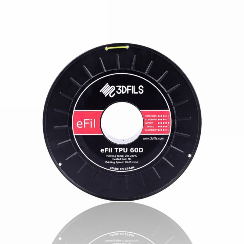 EsFil TPU 60D pertence à família eFil de filamentos flexíveis baseados em TPU. A sua dureza é Shore 60D, que é superior à dureza padrão dos filamentos flexíveis de impressão 3D no mercado. A dureza 60D é a dureza que pode ser encontrada em peças de borracha dura, bem como ter mais alongamento. Esta maior dureza permite trabalhar com filamentos flexíveis com a vantagem de uma maior facilidade de impressão.