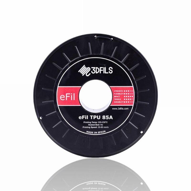 O eFil TPU 85A pertence à família eFil de filamentos flexíveis baseados em plástico TPU. A sua dureza é Shore 85A, semelhante à encontrada no calcanhar de um sapato. Este filamento é recomendado para utilizadores avançados, uma vez que requer uma curva de aprendizagem mais elevada do que materiais mais duros, mas seremos capazes de alcançar alongamentos de 520%. A sua flexibilidade torna-o ideal para aplicações onde são necessários materiais elásticos com muito boa recuperação. Além disso, podemos obter diferentes graus de dureza ao variar a percentagem de enchimento durante a impressão 3D.