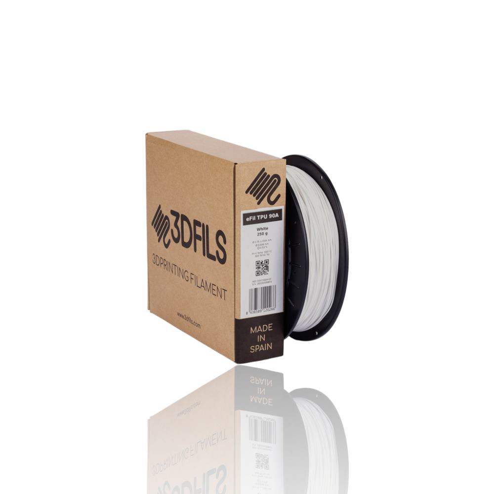 O eFil TPU 90A pertence à família eFil de filamentos flexíveis baseados em plástico TPU. A sua dureza é Shore 90A, que combina um elevado grau de flexibilidade com facilidade de impressão. Além disso, diferentes graus de dureza podem ser obtidos variando a percentagem de enchimento durante a impressão 3D. A dureza 90A pode atingir 470% de alongamento e é o que podemos encontrar, por exemplo, na sola de borracha de uma bota de trabalho. A sua resistência à tracção atinge 35 MPa e a resistência ao impacto é de 126 N/mm.