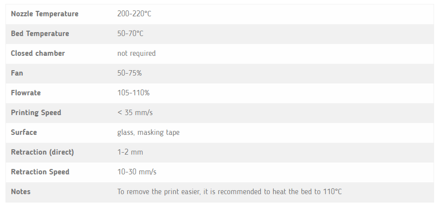 0º a 70º – Temp. recomendada da Heated bed (0ºC mediante aplicação de 3DLAC)