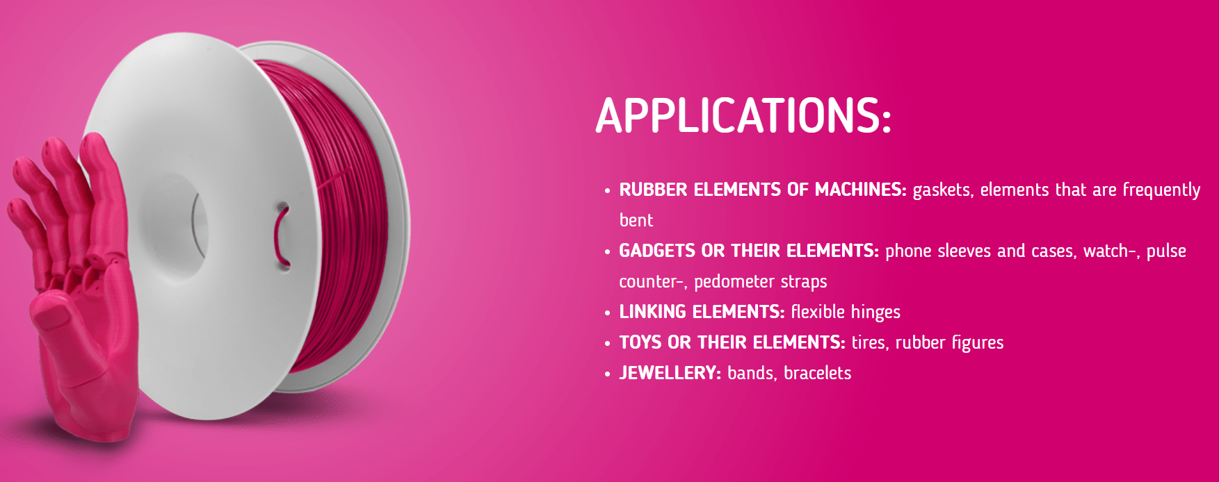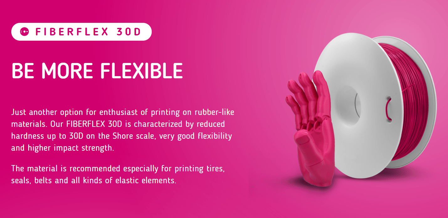O material é recomendado especialmente para a impressão de pneus, vedações, cintos e todo o tipo de elementos elásticos.