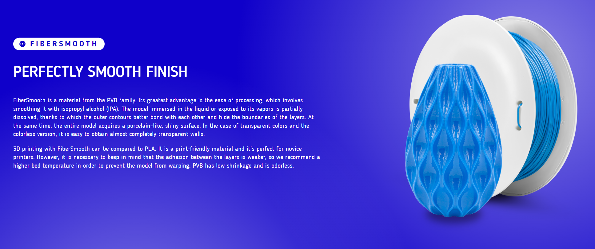 No entanto, é necessário ter em mente que a aderência entre as camadas é mais fraca, pelo que recomendamos uma temperatura de cama mais elevada, a fim de evitar que o modelo se empenue. O PVB tem baixo encolhimento e é inodoro.