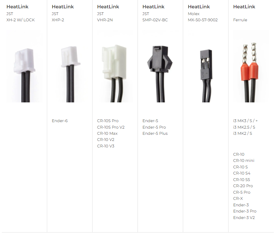A gama HeatLink é um grupo alternativo de termistores e cabos de aquecimento activados com conectores Molex micro-fit, complementados por vários cabos de interface curtos para ligação a dezenas de modelos de impressoras 3D para facilitar a sua utilização pelos seus proprietários.