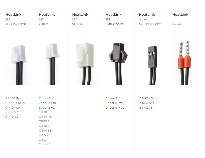 A gama HeatLink é um grupo alternativo de termistores e cabos de aquecimento activados com conectores Molex micro-fit, complementados por vários cabos de interface curtos para ligação a dezenas de modelos de impressoras 3D para facilitar a sua utilização pelos seus proprietários.