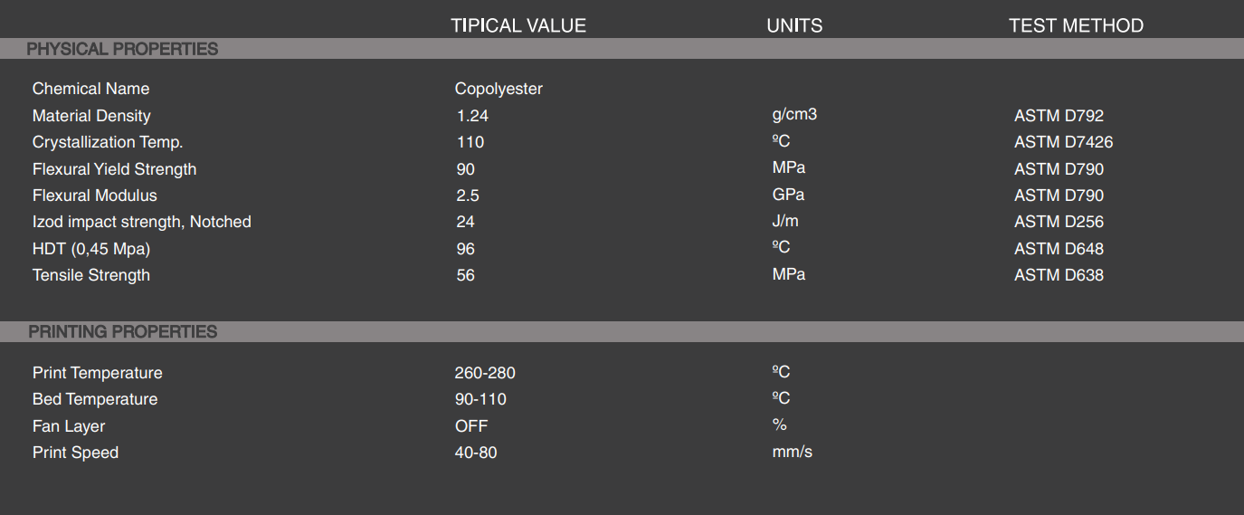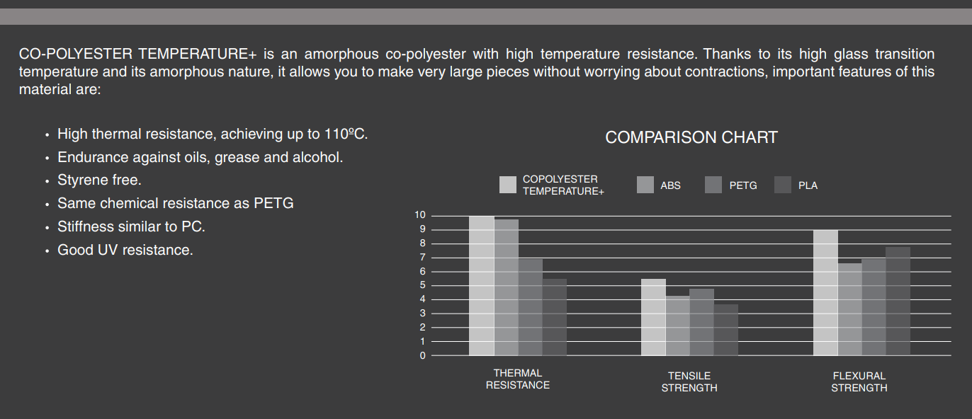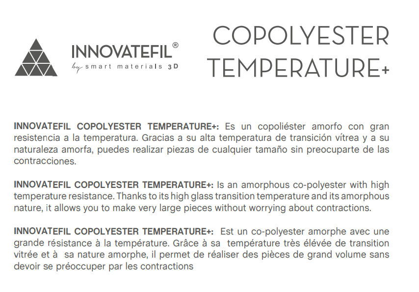 O Copolyester TEMPERATURE + Ć© um copoliĆ©ster amorfo com resistĆŖncia a altas temperaturas. GraƧas Ć alta temperatura de transição vĆtrea e Ć natureza amorfa, permite criar peƧas muito grandes sem se preocupar com contraƧƵes.