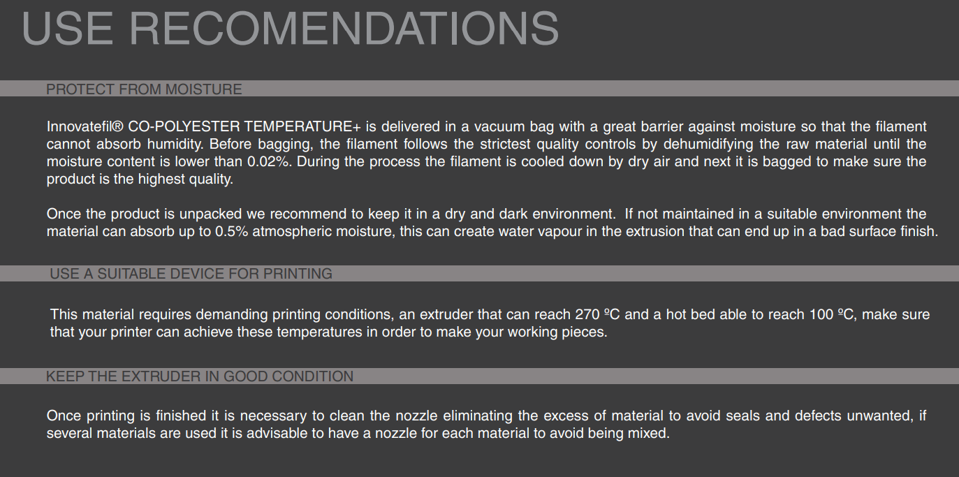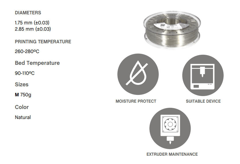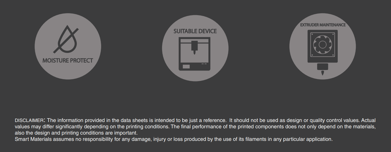 Este material Ć© altamente higroscópico, absorvendo rapidamente a humidade do ar passados poucos minutos após aberto, impossibilitando desta forma a correcta impressĆ£o 3D do mesmo. O resultado das impressƵes 3D de materiais com humidade tendem a ser frĆ”geis e de acabamento irregular ou em certos casos, torna-se simplesmente impossĆveis de imprimir.