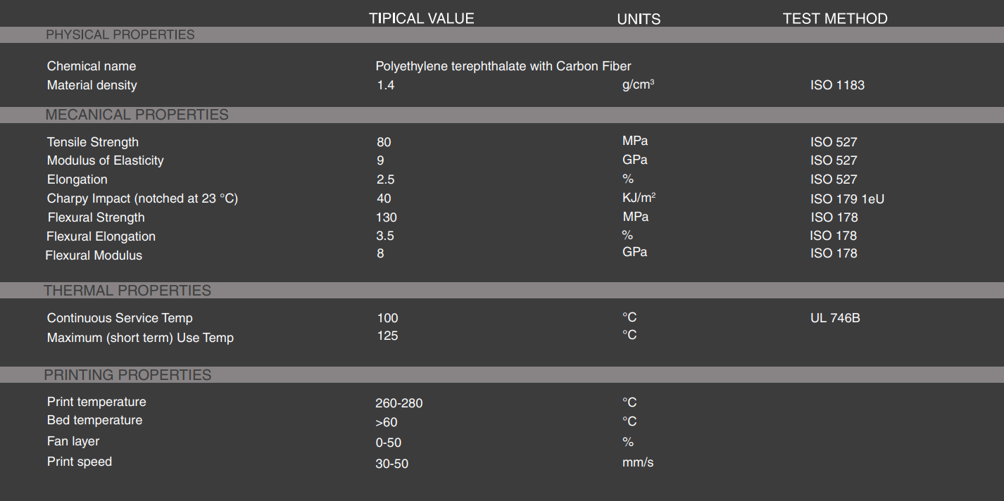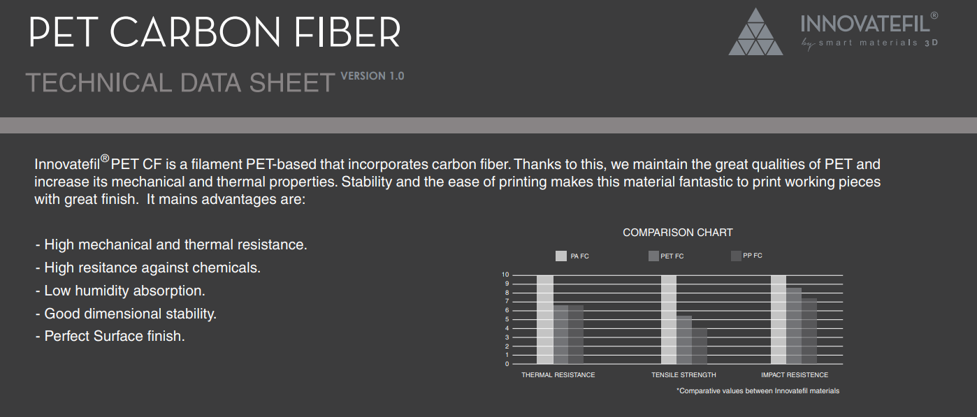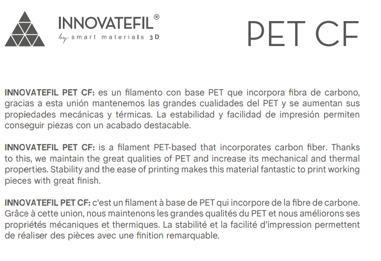 INNOVATEFIL PET CF é um filamento à base de PET que incorpora fibra de carbono. Graças a isso, mantêm-se as grandes qualidades do PET e aumentam-se as propriedades mecânicas e térmicas. Estabilidade e facilidade de impressão tornam este material fantástico para imprimir peças de trabalho com ótimo acabamento.