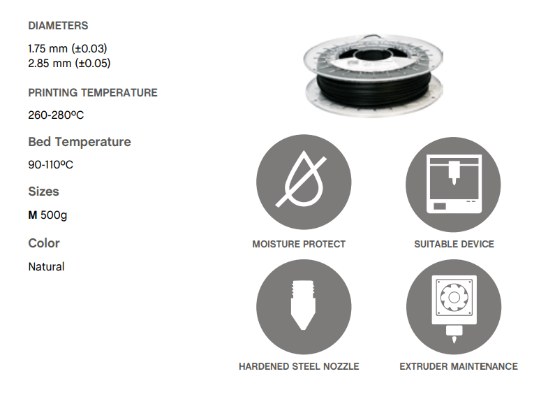 Este material é altamente higroscópico, absorvendo rapidamente a humidade do ar passados poucos minutos após aberto, impossibilitando desta forma a correcta impressão 3D do mesmo. O resultado das impressões 3D de materiais com humidade tendem a ser frágeis e de acabamento irregular ou em certos casos, torna-se simplesmente impossíveis de imprimir.