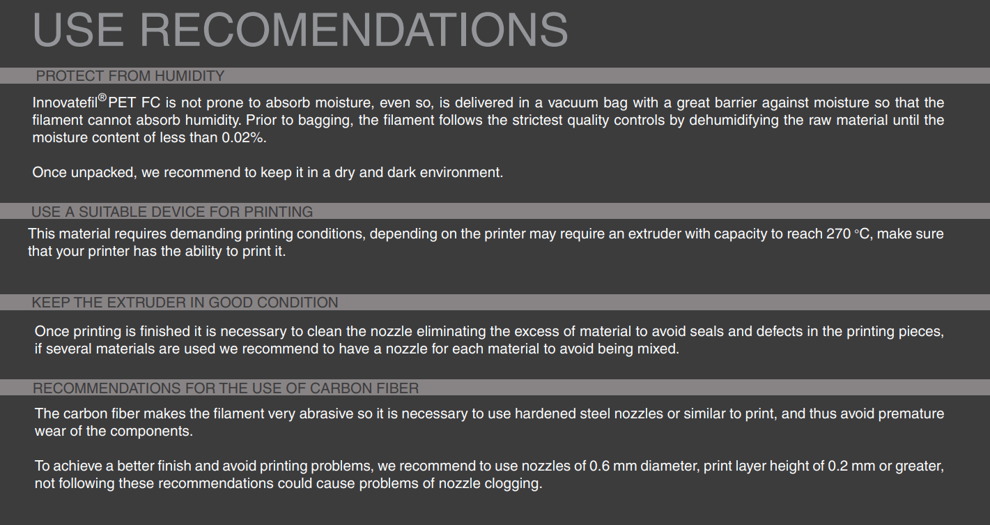O Innovatefil PET FC não é um material tão propenso à absorção de humidade como o PA CF, no entanto, recomenda-se o armazenamento em local seco. Antes do embalamento, o filamento segue os mais rigorosos controlos de qualidade ao desumidificar a matéria-prima até o teor de humidade ser menor que 0,02%.