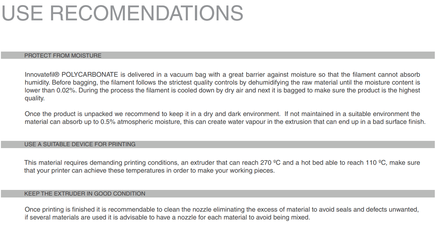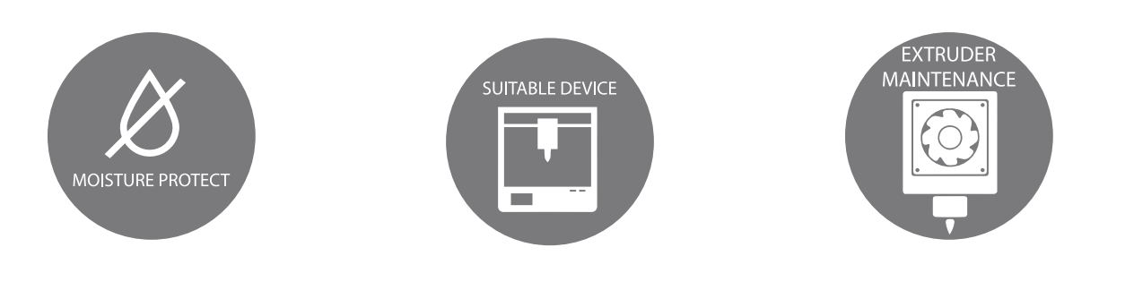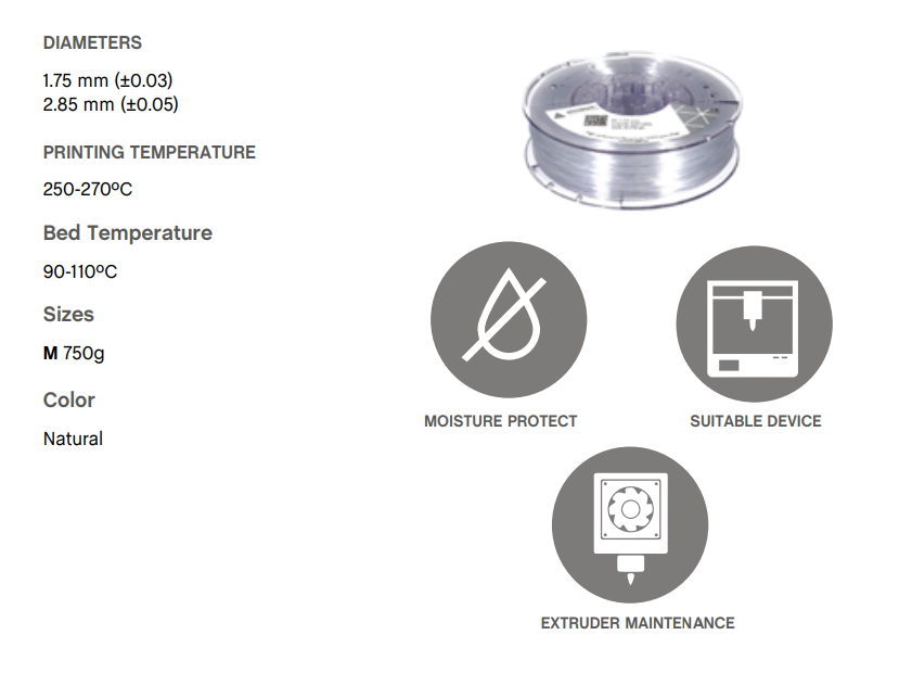 Este material é altamente higroscópico, absorvendo rapidamente a humidade do ar passados poucos minutos após aberto, impossibilitando desta forma a correcta impressão 3D do mesmo. O resultado das impressões 3D de materiais com humidade tendem a ser frágeis e de acabamento irregular ou em certos casos, torna-se simplesmente impossíveis de imprimir.