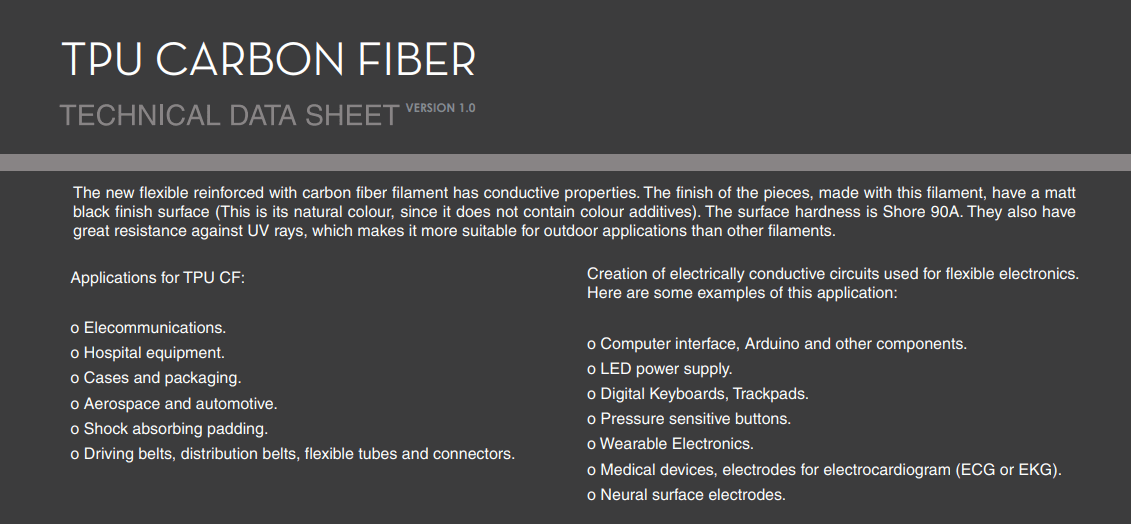 INNOVATEFIL TPU FC CARBON FIBER CF , Termoplástico de elastómero reforçado com fibra de carbono. Com este filamento é possível imprimir objectos flexíveis, com uma elevada qualidade de impressão.