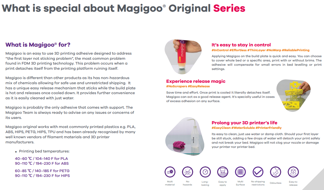 Magigoo é a nova geração de componentes de aderência à base de impressão 3D. Os produtos de geração anterior eram em formato de spray,que precisam de ser pulverizados com a base fora da impressora 3D para evitar a deterioração dos componentes da impressora 3D, contaminam o ambiente e são irritantes se utilizados em locais fechados.