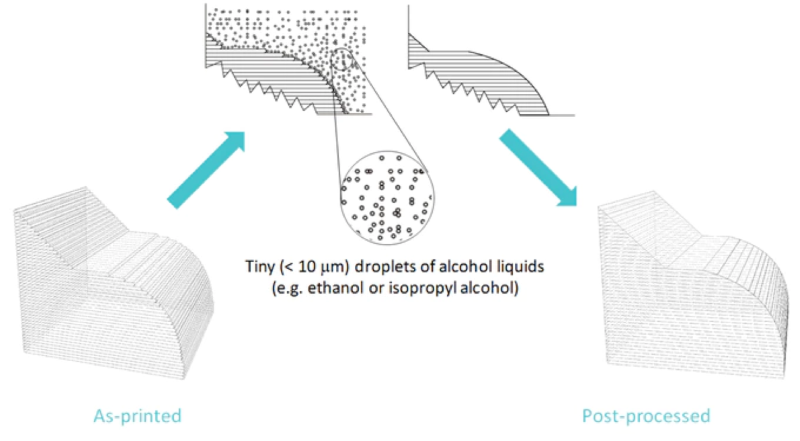 A tecnologia Layer-Free™ envolve a exposição de uma peça impressa em 3D a um aerossol de micro-gotas de álcool, geradas por uma membrana perfurada, rapidamente vibratória, chamada nebulizador. O aerossol será então adsorvido pela superfície da peça impressa em 3D e torná-la-á lisa e sem camadas.
