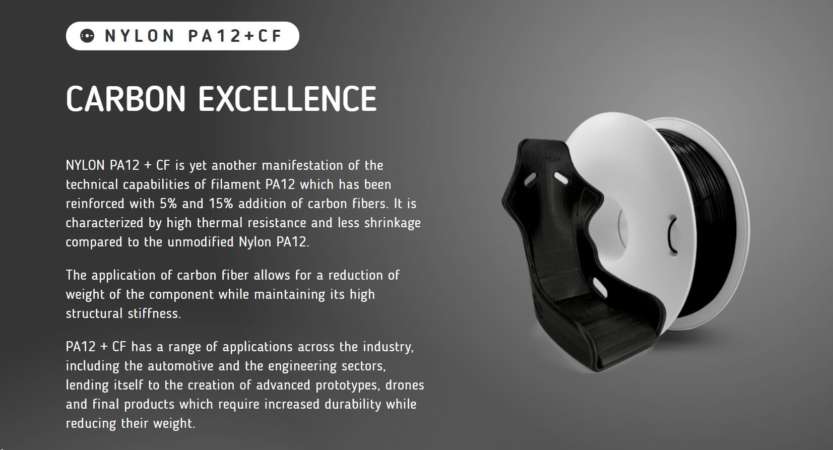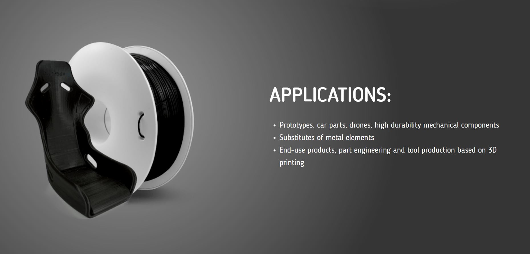 O PA12+CF tem uma gama de aplicações em todo o sector, incluindo os sectores automóvel e de engenharia, sendo perfeito para a criação de protótipos avançados, drones e produtos finais que exigem uma maior durabilidade, reduzindo ao mesmo tempo o seu peso.
