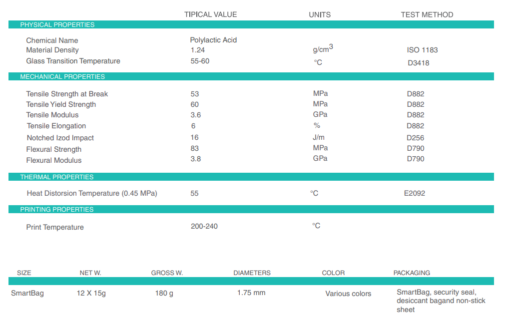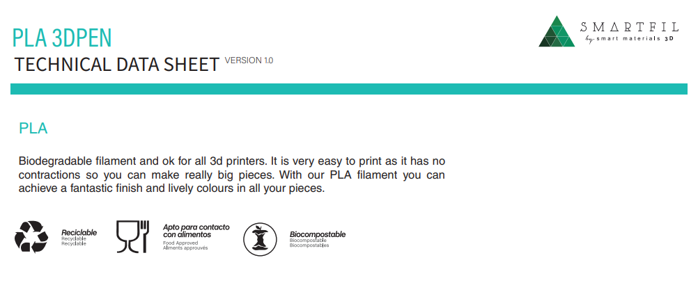 O filamento PLA é um polímero estável, permanente e inodoro. Como contrapartida do PLA em relação ao ABS cabe mencionar que a sua temperatura de amolecimento é de 60ºC em relação aos 100ºC do ABS.