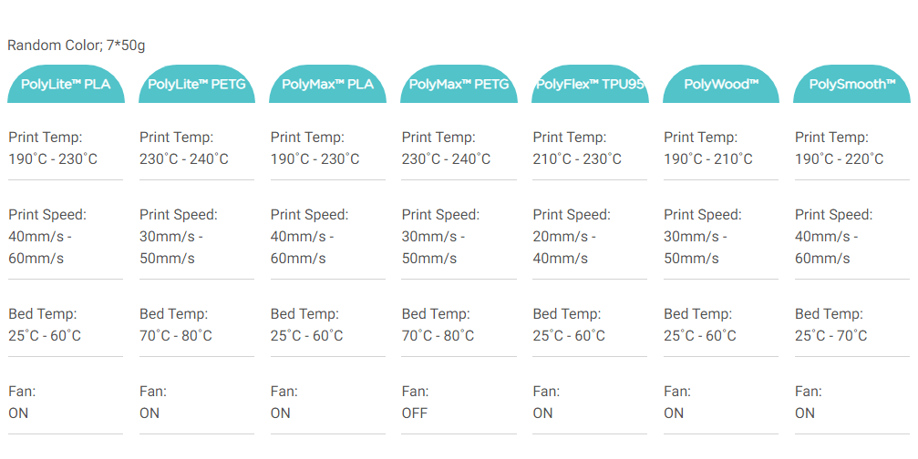 Caixa de Amostragem 1 contém 7×50g de amostras: PolyLite PLA, PolyLite PETG. PolyMax PLA, PolyMax PETG, PolyFlex TPU95, PolyWood e PolySmooth. Estas amostras podem ser impressas em quase todas as impressoras 3D.