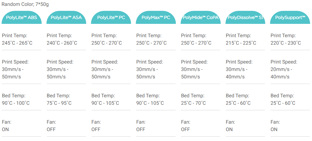 A Caixa de Amostra 2 contém amostras de 7×50g: PolyLite ABS, PolyLite ASA, PolyLite PC, PolyMax PC, PolyMide CoPA, PolyDissolve S1 e PolySupport. Estas amostras necessitam de uma impressora 3D com função de invólucro ou dupla extrusão.