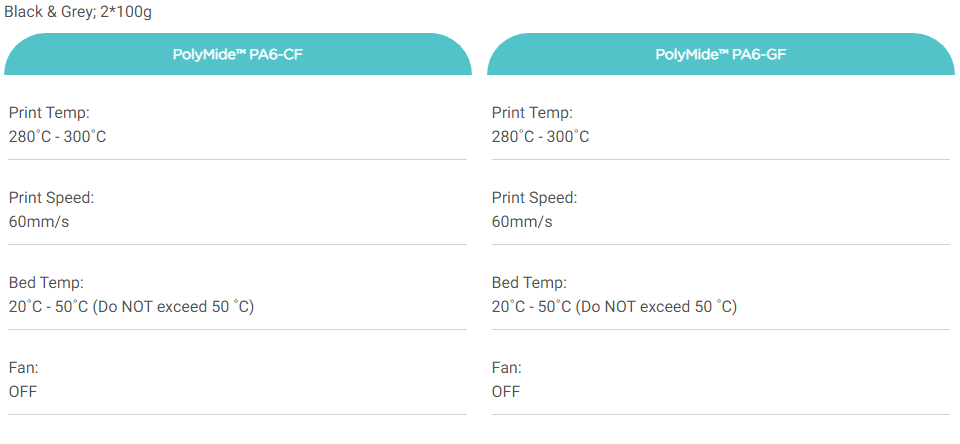 A Caixa de Amostra 3 contém amostras 2×100g: PolyMide PA6-CF e PolyMide PA6-GF. Estas amostras requerem uma impressora 3D que pode atingir uma temperatura de 300°C e está equipada com um nozzle resistente à abrasão.