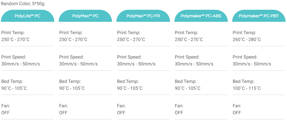 A Caixa de amostras 4 contém amostras de 5×50g: PolyLite PC, PolyMax PC, PolyMax PC-FR, Polymaker PC-ABS e Polymaker PC-PBT. Também está incluída uma amostra de Magigoo PC. Estas amostras necessitam de uma impressora 3D com invólucro para melhorar o desempenho das peças.
