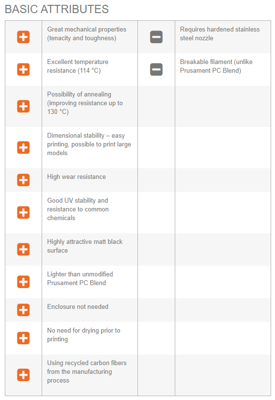 PCCF (Prusament PC Blend Carbon Fiber) tem qualidades de impressão semelhantes às do PC Blend não modificado, mas a adição das fibras de carbono torna-o ainda mais forte, mais resiliente, mais resistente à temperatura e dimensionalmente estável.