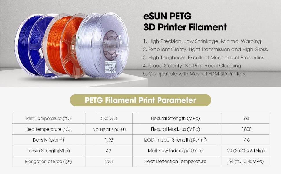 O filamento PETG ESUN  é compatível com quase todas as impressoras 3D, incluindo impressoras RepRap e MakerBot, Ultimaker, Bits from Bytes, Airwolf3D, Makergear, Printrbot, Bukobot, Creality,  Type A Machines e muitas mais.