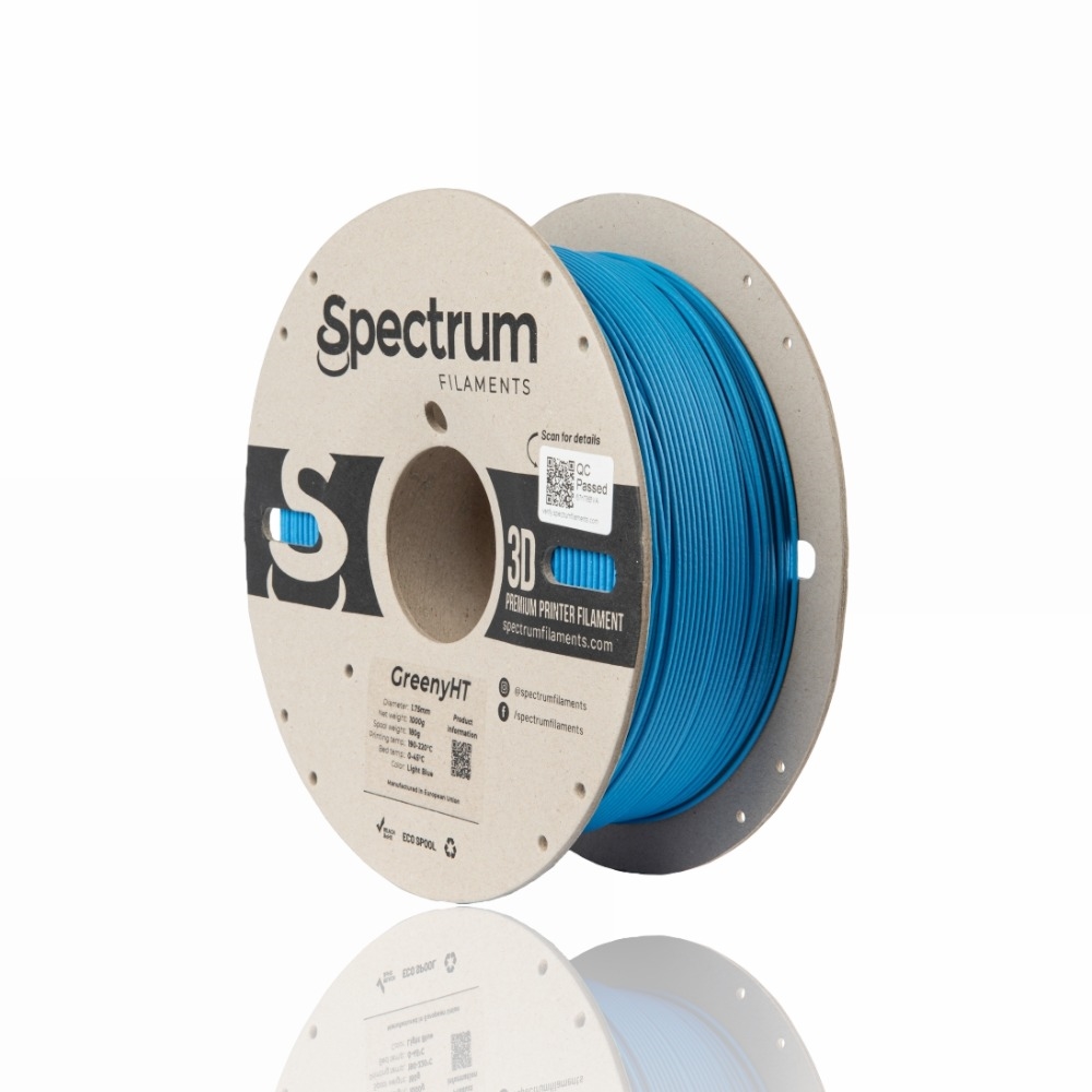 Após meses de testes de implementação, a Spectrum Filaments desenvolveu um novo filamento GreenyHT baseado num biopolímero de alto desempenho com uma temperatura de amolecimento (VICAT) de até 100°C e resistência térmica (HDT B) de até 90°C. Além de melhorar as propriedades térmicas, também se procurou não desviar das características mecânicas originais do plástico, razão pela qual o GreenyHT não contém plastificantes. Além disso, em termos de rigidez e dureza, supera significativamente as especificações do PLA clássico.