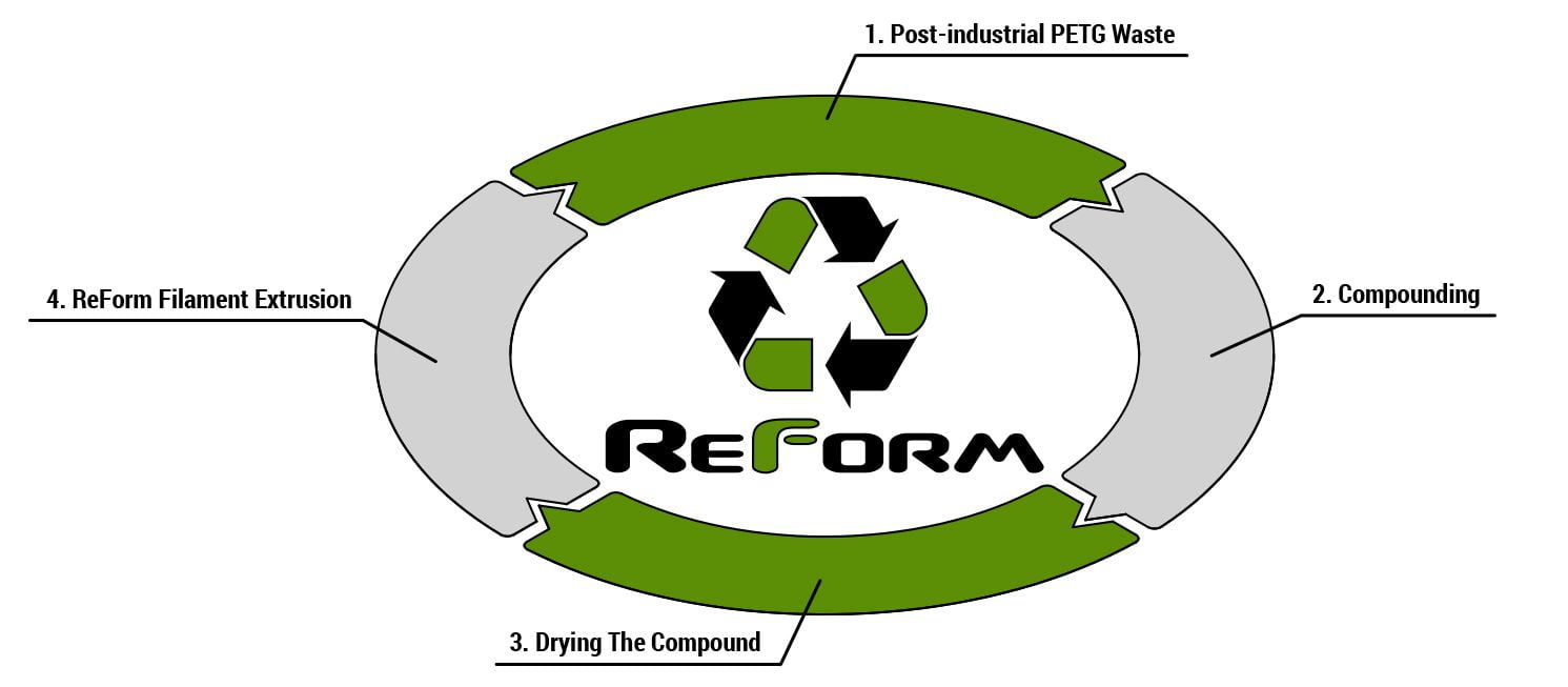 ReForm is a sustainable initiative within Formfutura to efficiently manage residual extrusion waste streams and re-use them into high-end upcycled filaments. The ideology behind ReForm is to a make 3D printing more sustainable – without having to make compromises on material properties – and yet keep it affordable.