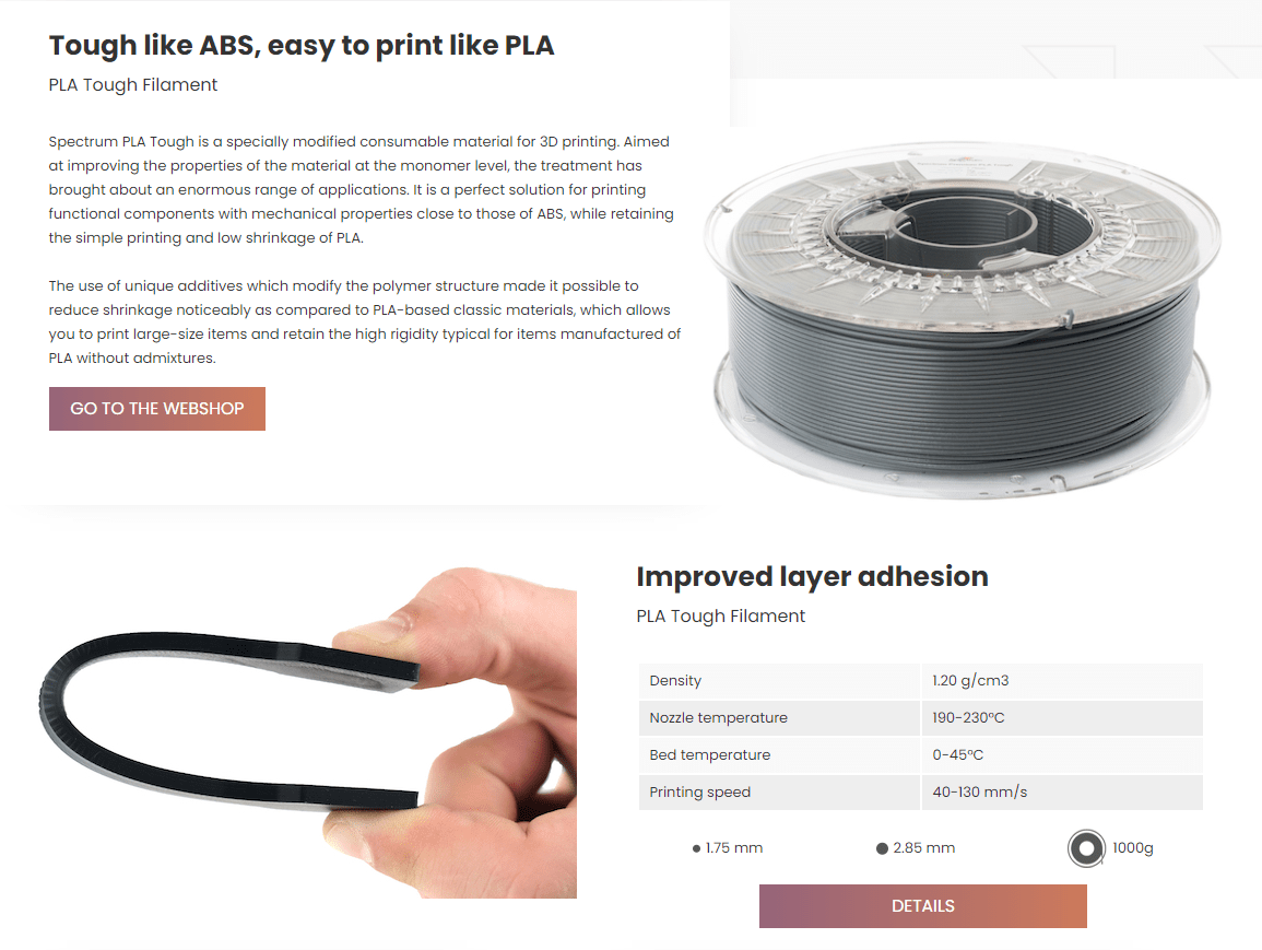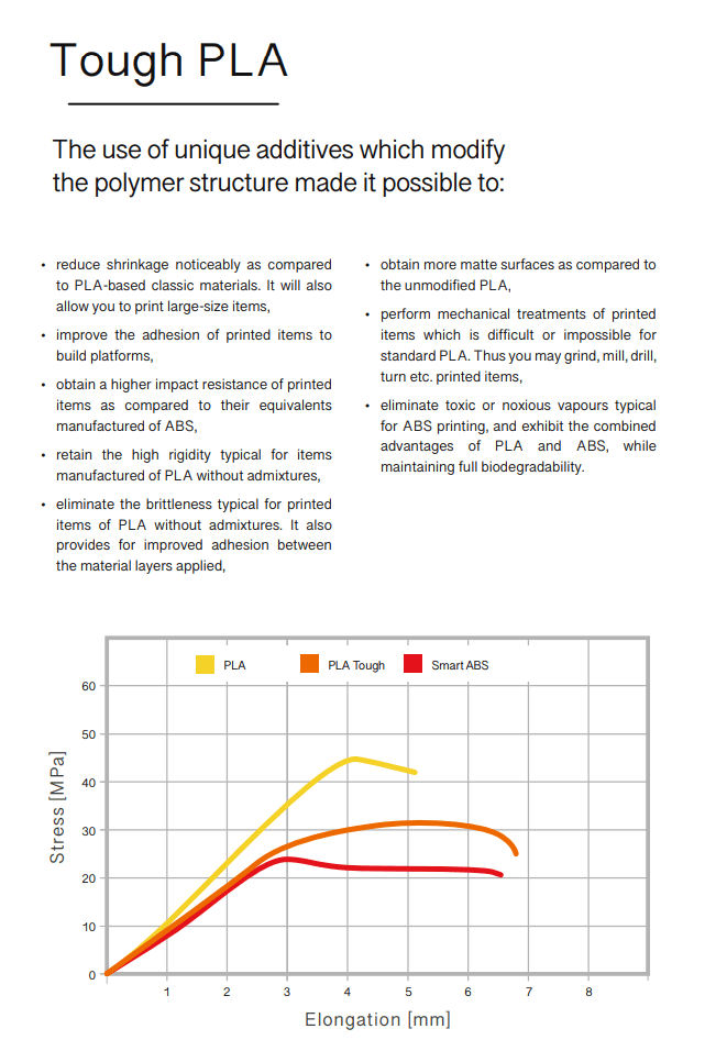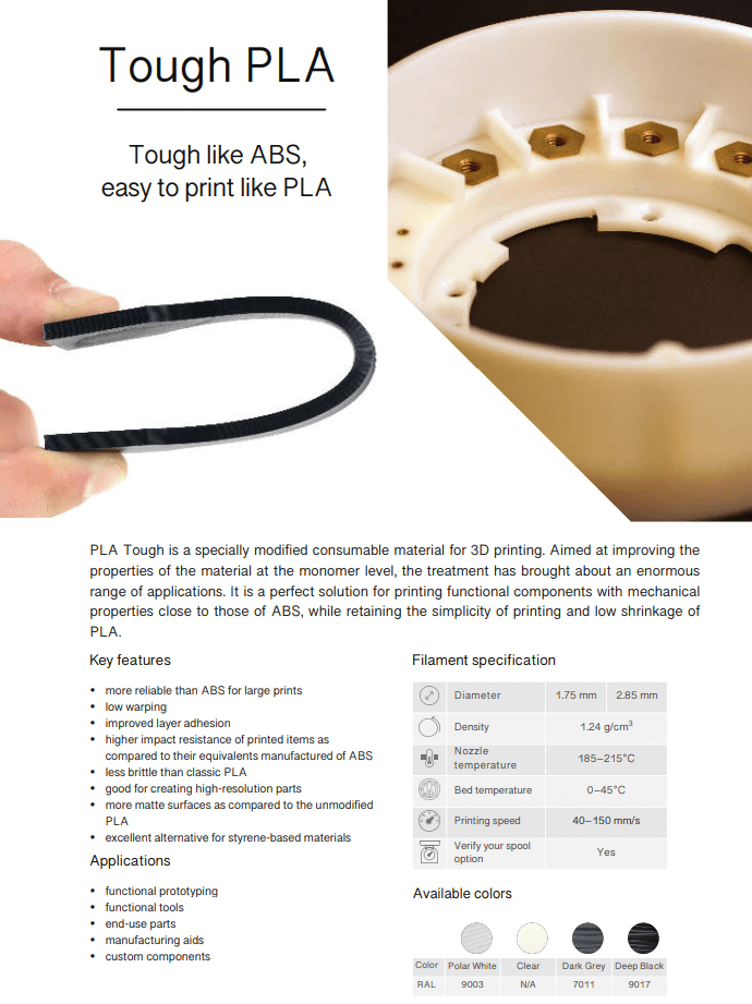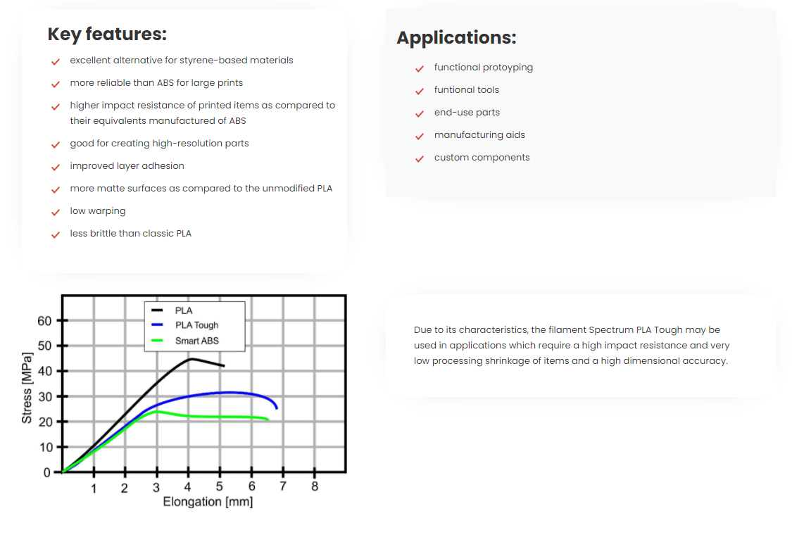 O filamento PLA Tough da Spectrum Filaments é a solução perfeita para a impressão de componentes funcionais com propriedades mecânicas próximas às do ABS , mantendo a impressão de uma forma simples e com uma baixa taxa de retracção.