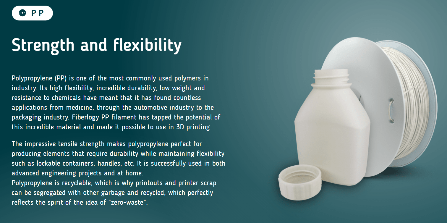 O polipropileno (PP) é um dos polímeros mais utilizados na indústria. A sua elevada flexibilidade, durabilidade incrível, baixo peso e resistência aos produtos químicos fizeram com que encontrasse inúmeras aplicações da medicina, passando pela indústria automóvel para a indústria de embalagens. O filamento PP de fibra de vidro aproveitou o potencial deste material incrível e tornou possível a utilização na impressão 3D.