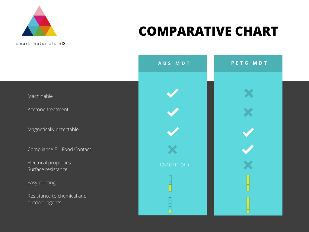 Ao contrário dos filamentos existentes no mercado reforçados com pós ferromagnéticos, o MDT PETG é detetável por todos os detetores de metal disponíveis no mercado, tanto através de ímã permanente quanto com os mais modernos com bobinas balanceadas. A sua composição não requer o uso de fibras de aço ou pós metálicos, e não contém fibras de carbono, grafite ou negro de carvão.