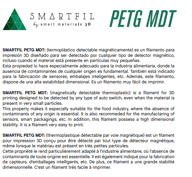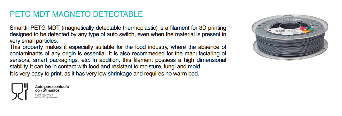 PETG MDT (termoplástico detetável magneticamente) é um filamento para impressão 3D criado para ser detetado por qualquer tipo de detetor magnético, mesmo quando o material está presente em partículas muito pequenas.