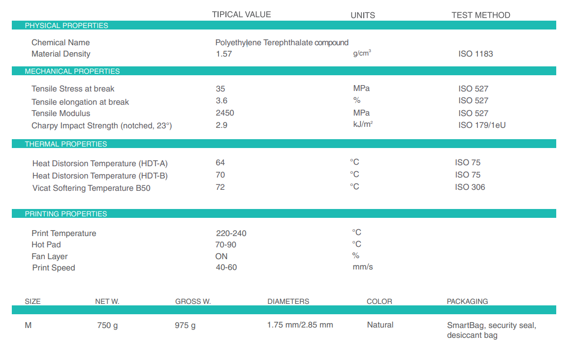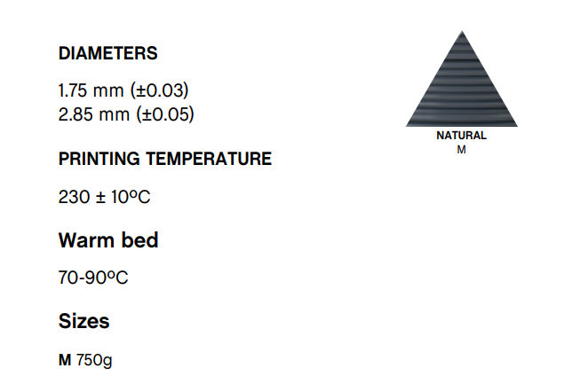 É um filamento muito fácil de imprimir, uma vez que tem um baixo encolhimento. É aceite para utilização com produtos alimentares de acordo com a regulamentação europeia. Não emite odores e tem uma elevada resistência química.