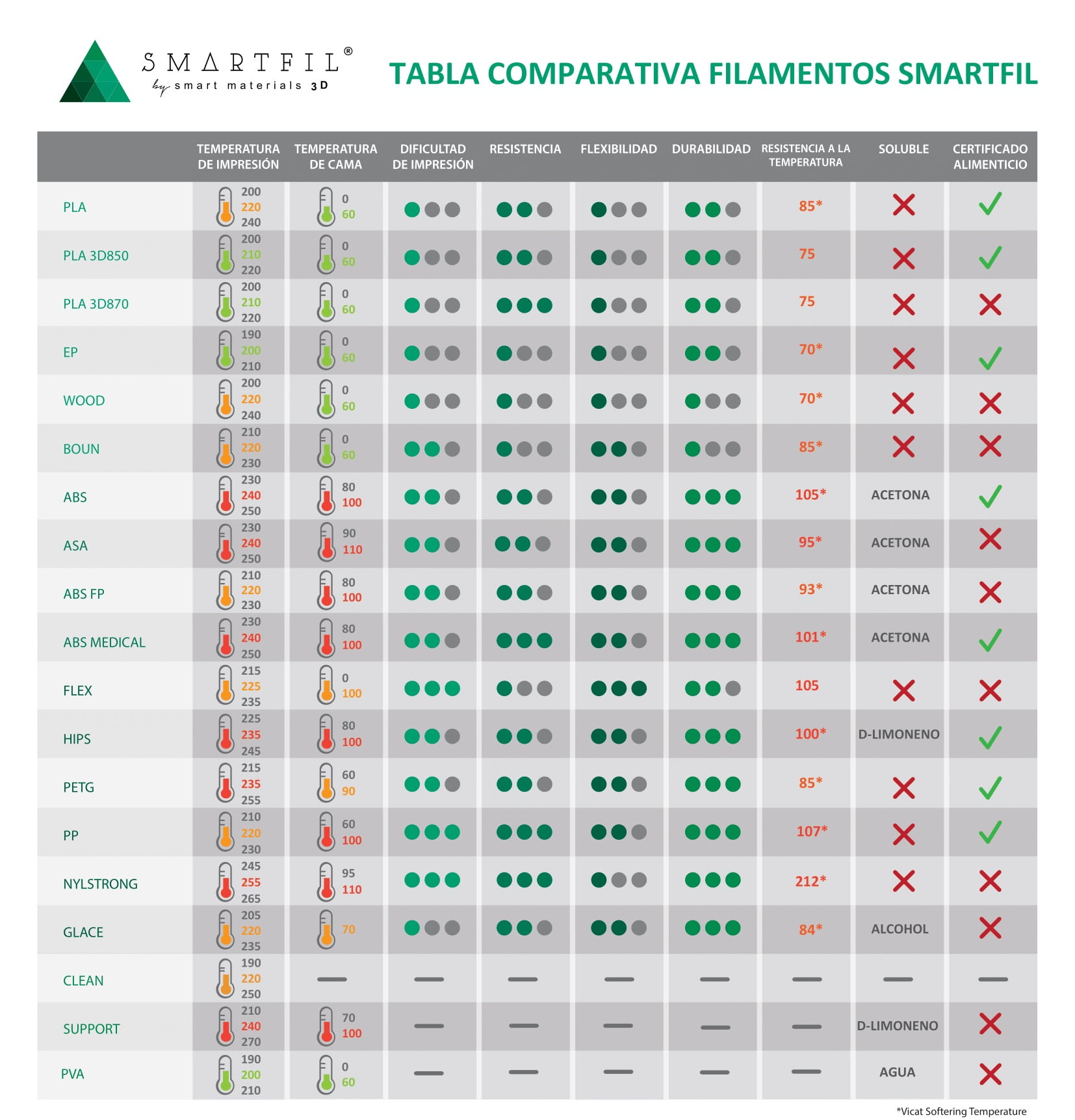 O filamento PLA é um polímero estável, permanente e inodoro. Como contrapartida do PLA em relação ao ABS cabe mencionar que a sua temperatura de amolecimento é de 60ºC em relação aos 100ºC do ABS.