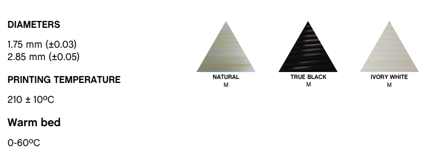 Este filamento não necessita de cama de aquecimento e tem propriedades mecânicas e térmicas mais elevadas do que a PLA padrão.