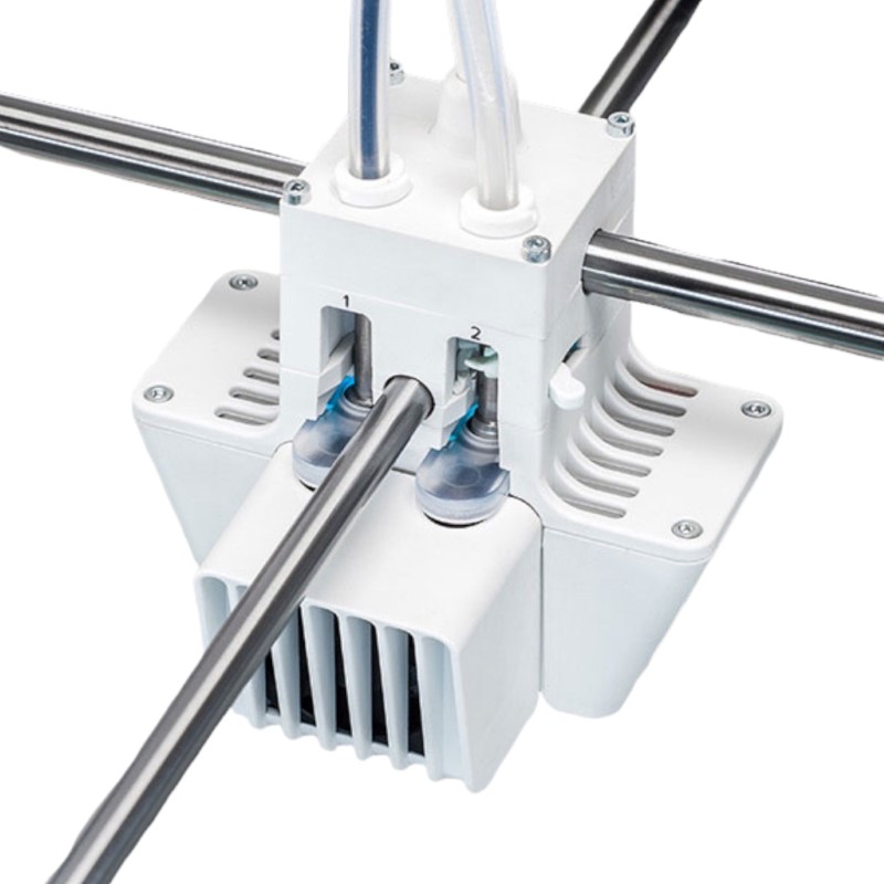 Extrusão dupla, com mecanismo de elevação automática do nozzle. Print Cores intercambiáveis e de fácil substituição. |